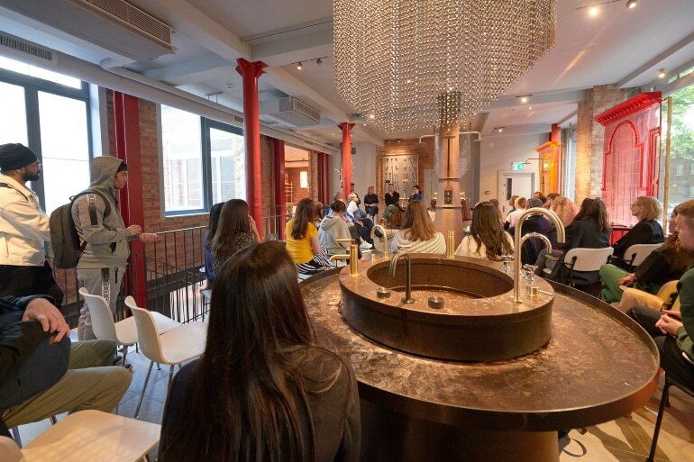 Unsurprisingly then, there are references to chimneys and furnaces and liberal use of cast iron on the ground floor. Using the material immediately imbues a relatively new brand with a sense of heritage and solidity. However, the architect also introduced a playful, contemporary sense of lightness too, with casts of Victorian bathroom wall panels in orange and amber resin. Different areas are delineated with curtains made from steel rings.